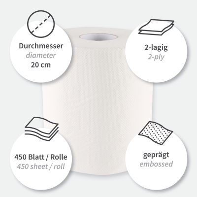 Die Handtuchrollen sind perforiert, so dass das Abreißen der einzelnen Tücher leichter geht. Die Großrolle mit ca. 450 Blatt ist ideal als Putztücher oder Wischtücher für hygienische Sauberkeit in Produktionen, Lebensmittelindustrie, in Küchen oder auch als Papierhandtücher in Umkleiden und Toilettenräumen. Die Handtuchrollen haben eine Innenabwicklung und sind für alle gängen Spender geeignet.